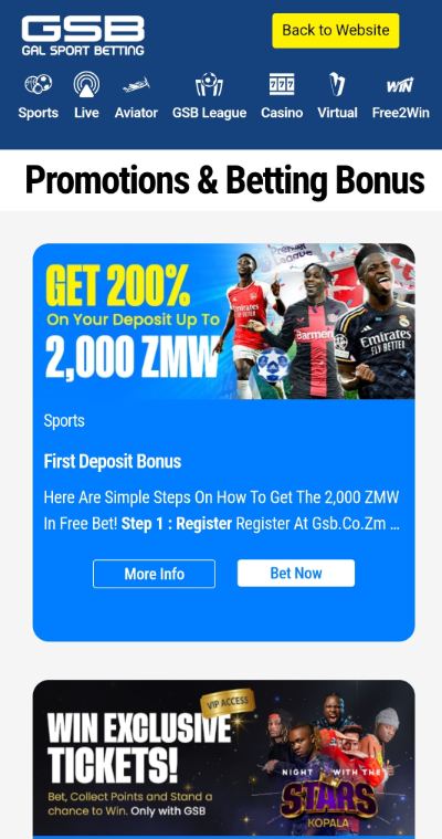 After successfully managing Gal Sport Betting register in Zambia, you can enjoy the GSB welcome bonus for Zambian players, offering a 200% deposit match up to ZMW 2,000.